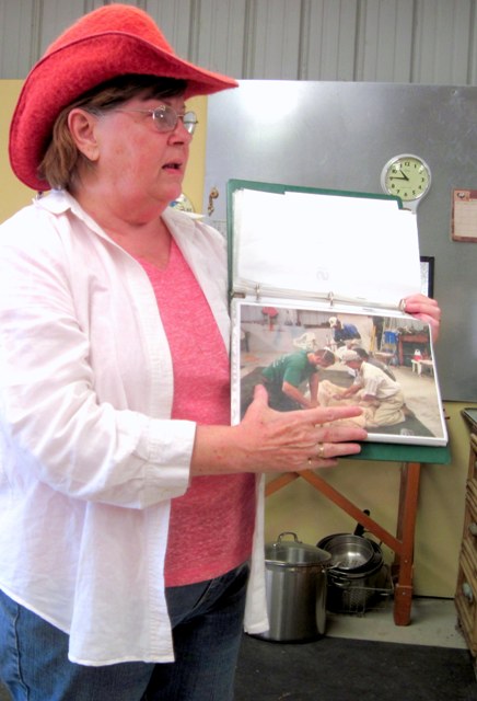 Sandra explaining shearing day - and wearing alpaca red felt cowboy hat.